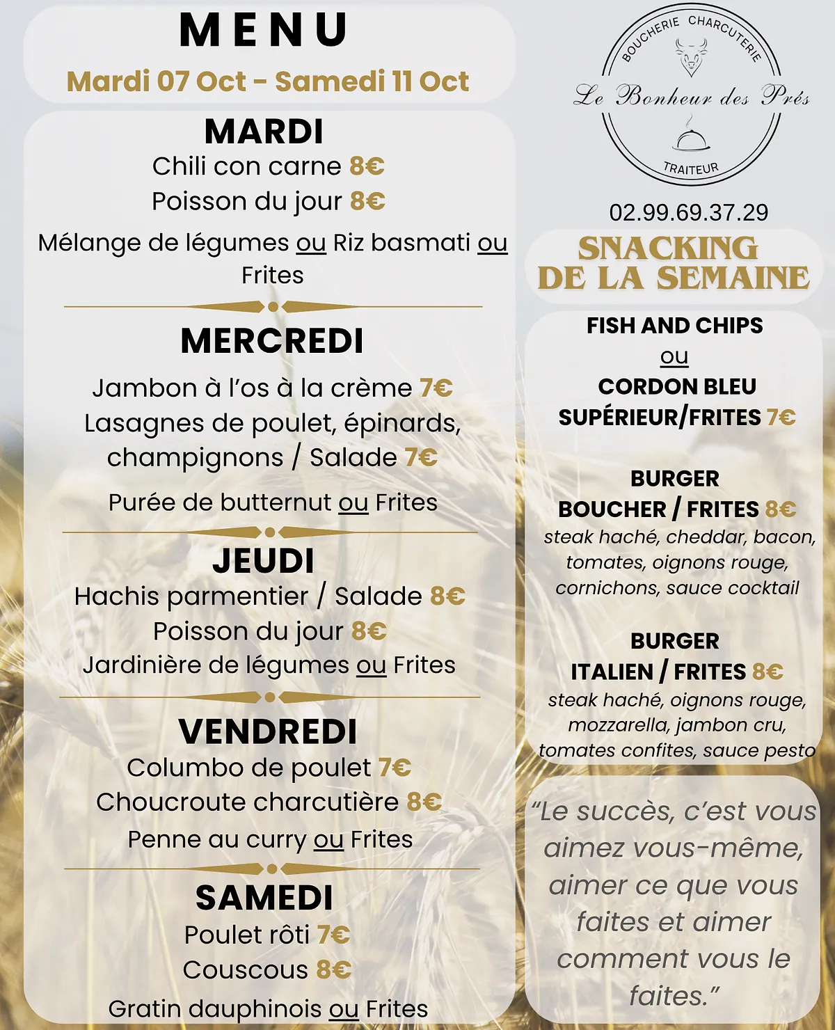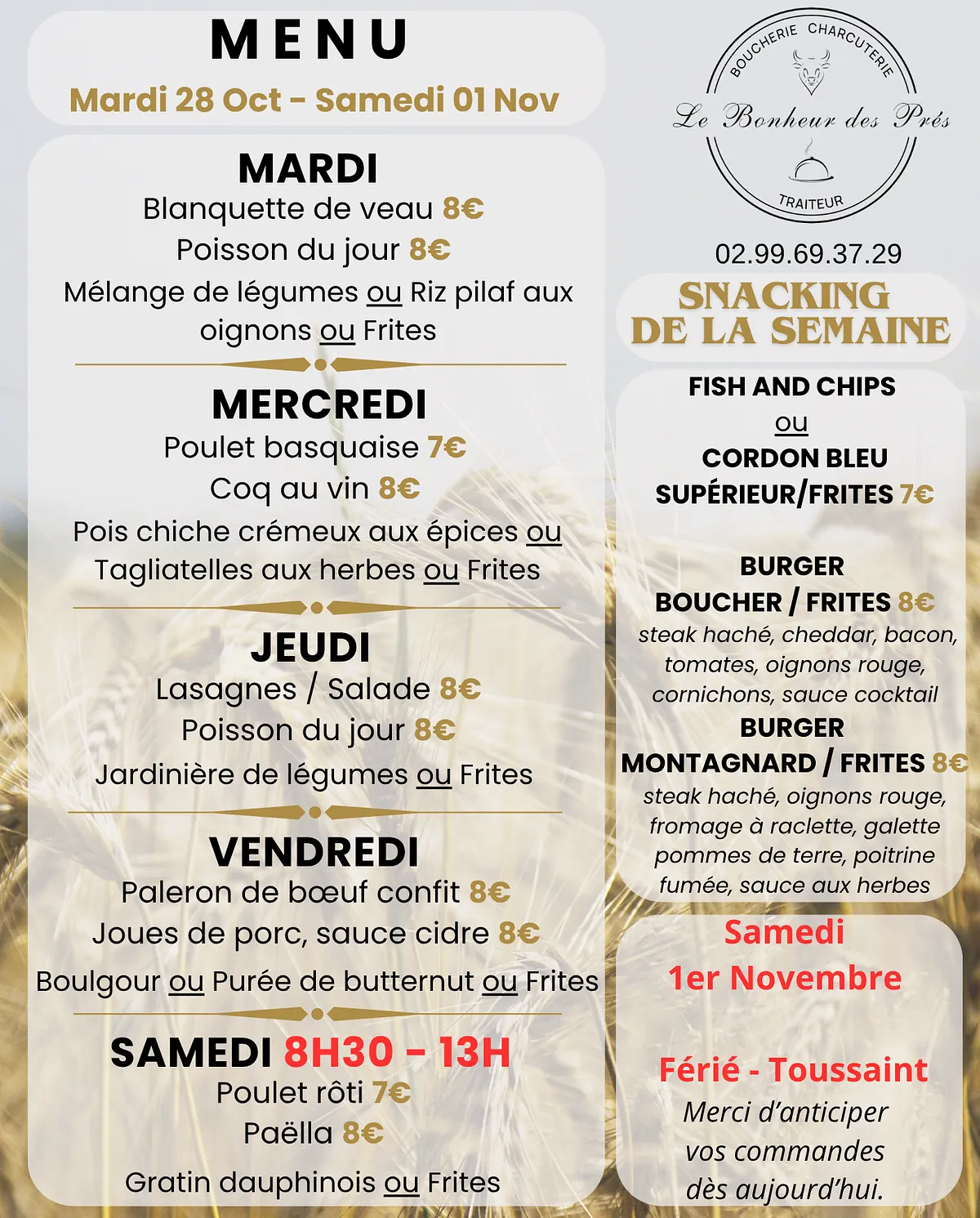Bonne humeur et dynamisme au rendez-vous ! Venez découvrir notre gamme traiteur, de plats à emporter, cocktail dinatoire, plats à déguster en famille... Viande et charcuterie de qualité, vous serez conseillés et servis comme il se doit.